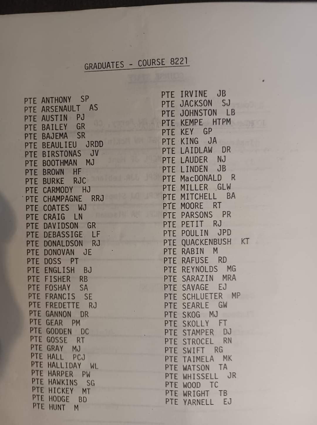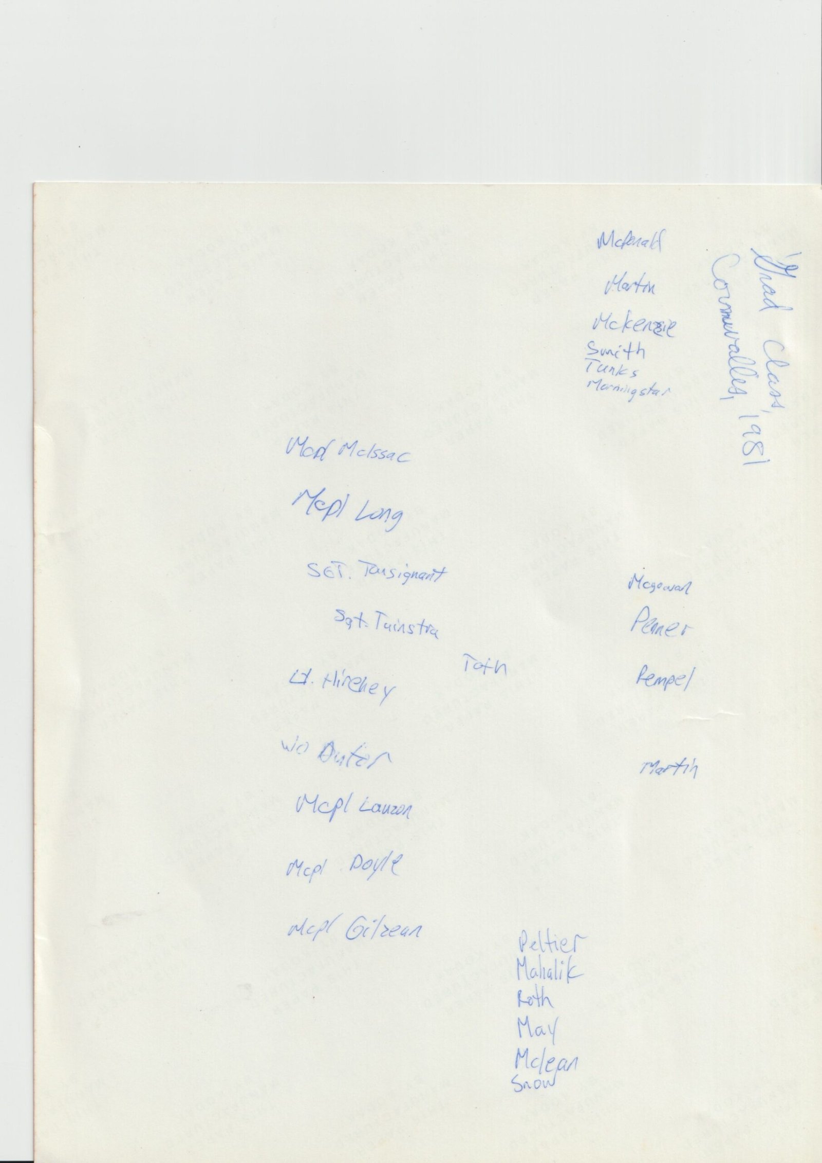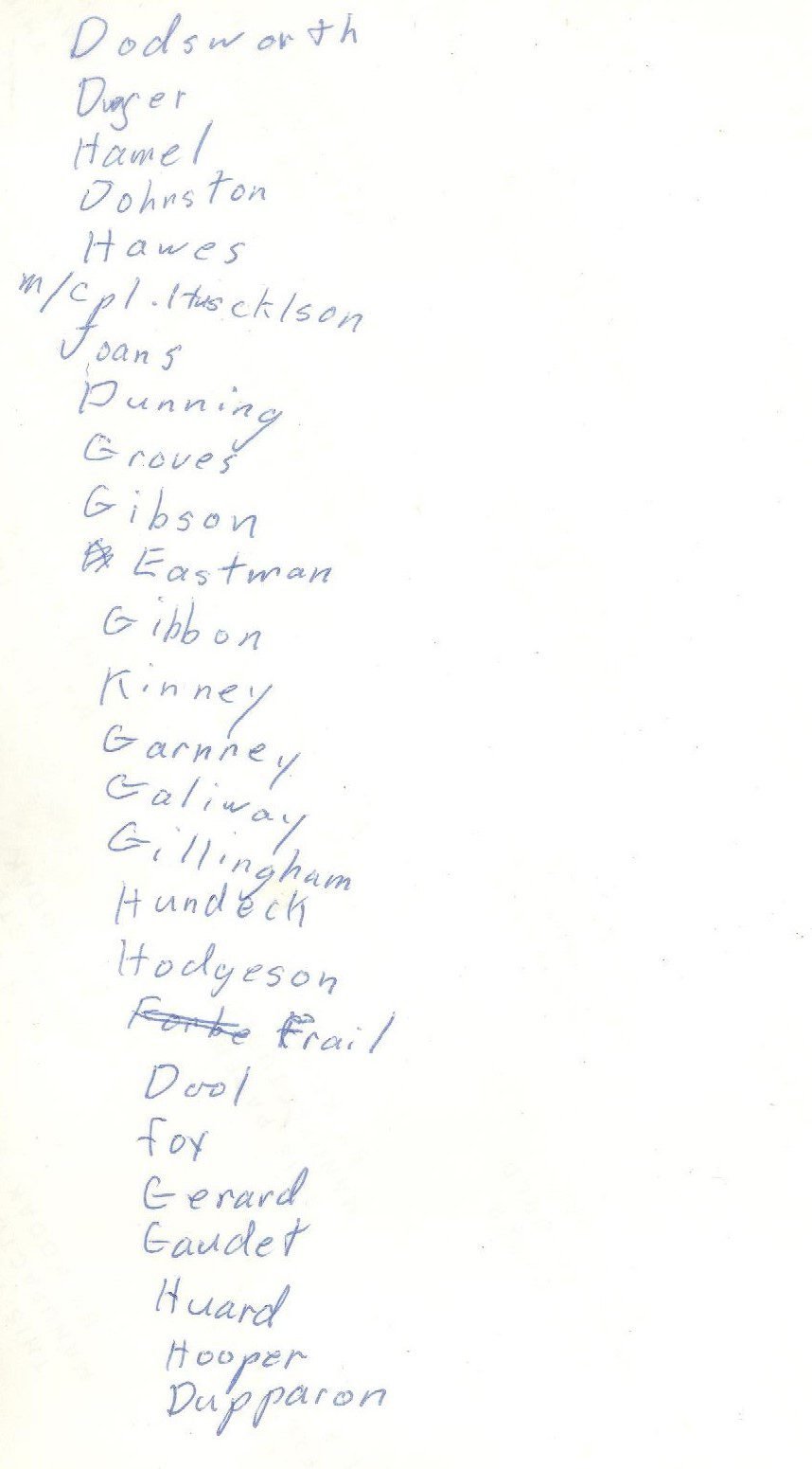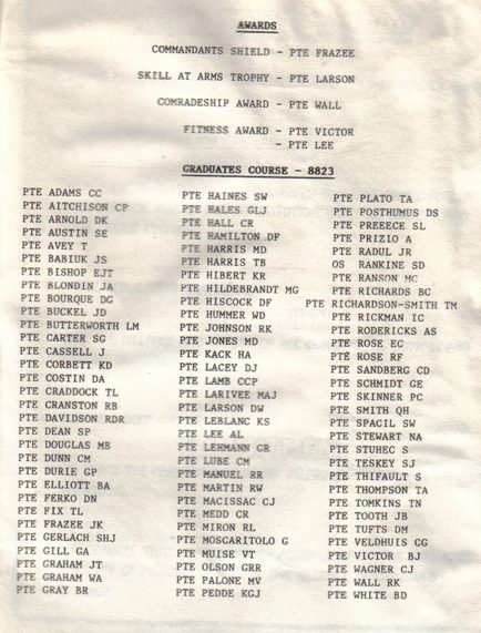 Recollections are not as strong as I wished, but some of the staff were Sgt King, WO Churchill, MCpl Dogget(spelling?), and MCpl Seguin.